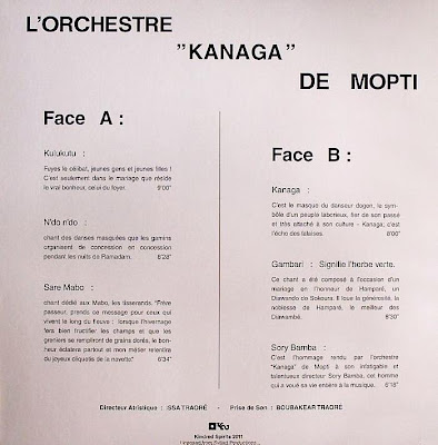 In July of 1976, after months of intense musical and cultural research, the orchestra visited the Radio Mali recording studio in order to document its new musical evolution. Six of these songs were featured on the only album by Kanaga De Mopti released in 1977 courtesy of Mali Kunkan, an ad hoc label formed around the Ministry of Youth, Sports, Art and Culture. On side one, the infectious 'Kulukutu' and its mesmerizing vocal introduction focuses on the celebration and the joys of marriage between young men and young girls. 'N'Do N'Do" digs deeper into the Dogon culture as it displays the masked dances and processions performed by kids on Ramadan nights. The call and response add up to the strong and fierce excitement one can sense within the recording studio. Closing side one, with its introductory bell gimmick, 'Sare Mabo' is dedicated to the cloth weavers. Bamba plays the traditional fula flute at the end of that track, giving it a rural edge while the sturdy horns display their powers. Side two opens up with one of Bamba's most amazing compositions, 'Kanaga,' an homage to the Dogon mask and to the dancers who wear it during ritual ceremonies. The brass section is exceptional all throughout the record with tremendous riffs on that track. Electric guitar and organs swirl effortlessly around the melodies on songs like "Gambari" [trans: 'green grass'], a griot-like song praising a powerful groom. 'Sorry Bamba' is another praise song which extols the virtues of its famous band leader. Stuck in the past but looking towards the future with its incredible mix of traditional and modern instruments, Kanaga instantly reaches the higher level of African music classicism'.